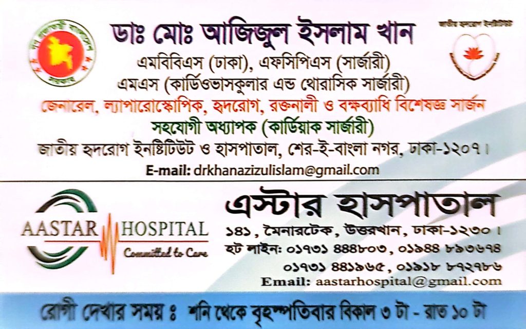 Dr. Azizul Islam Khan General laparoscopic, Cardiovascular Disease, Vascular & Thoracic Surgeon MS- (Cardiovascular & Thoracic Surgery) General, Colorectal, laparoscopic Surgeon and Associate Professor (Cardiac Surgery Department) জাতীয় হৃদরোগ ইন্সিটিউট ও হাসপাতাল